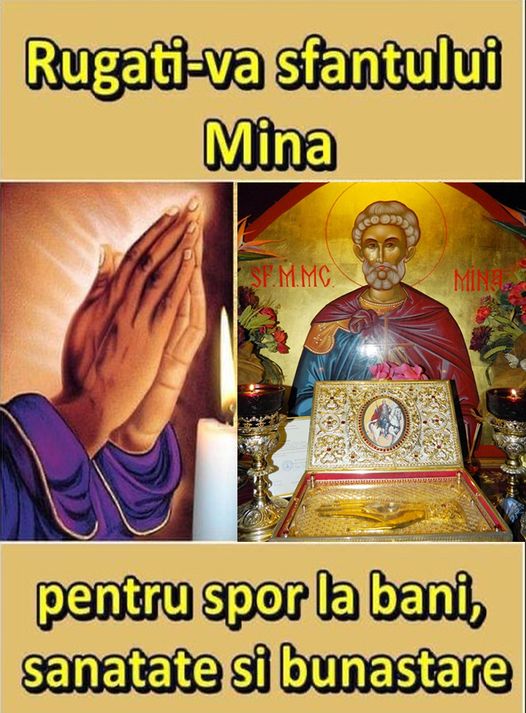 O, Preasfinte si intru tot laudate, Mare Mucenice Mina, si de minuni facatorule; primeste aceasta rugaciune de la mine nevrednicul robul tau, caci catre tine, ca la un adevarat izvor de tamaduiri si grabnic folositor si ajutator preaminunat , scap eu si catre sfant chipul icoanei tale cu lacrimi ma rog tie: