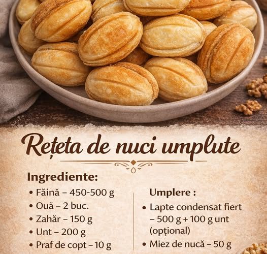Ingrediente: Aluat : Faina – 450- 500 g Oua – 2 buc. Zahar – 150 g Unt – 200 g Praf de copt – 10
